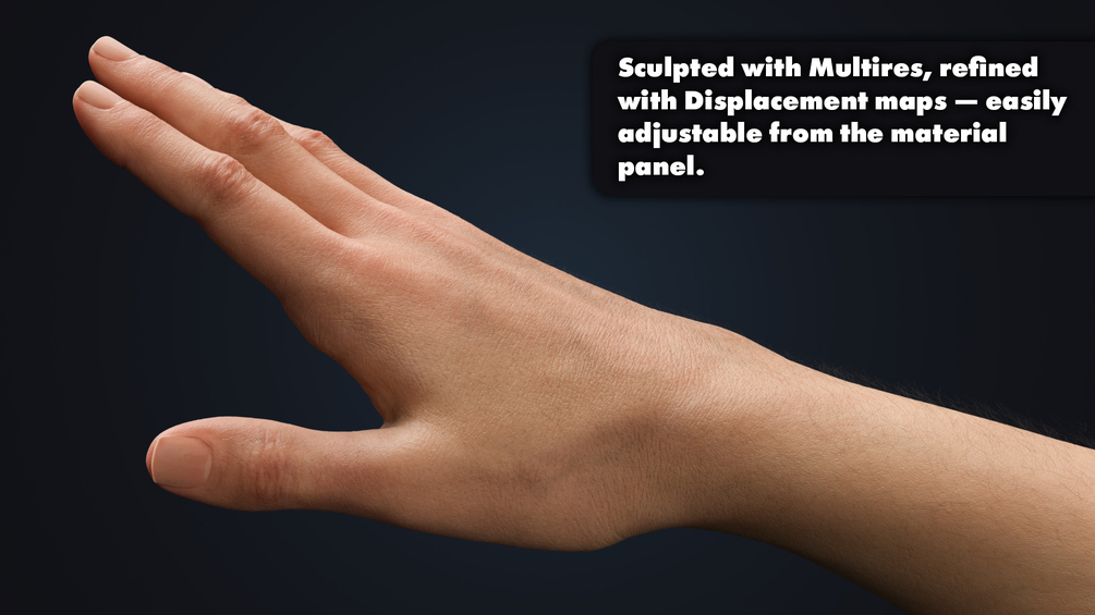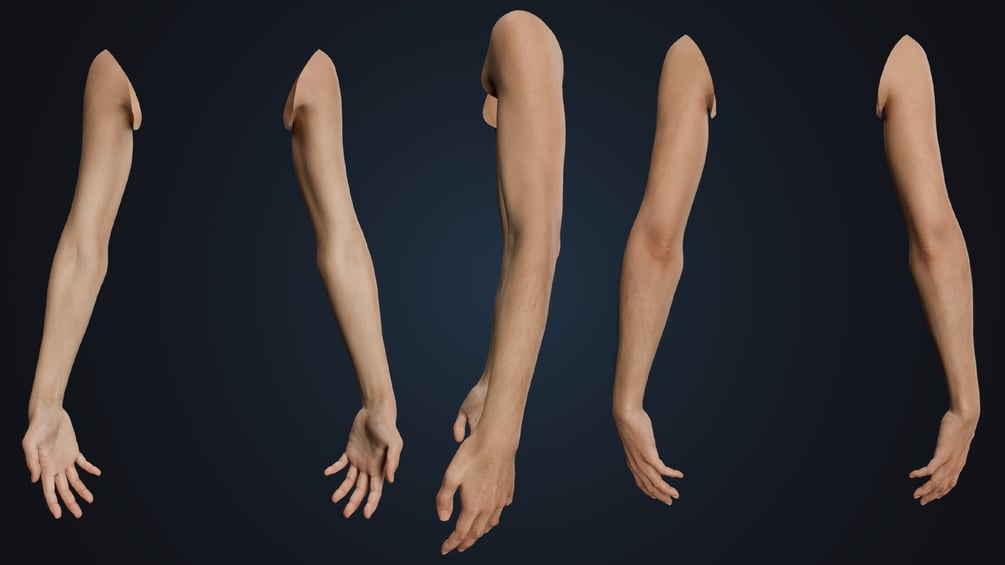 Balanced, athletic arms with soft anatomical detail and neutral skin tone. Subtle veins and surface texture add realism, with short, natural nails and smooth shading suitable for any character type.