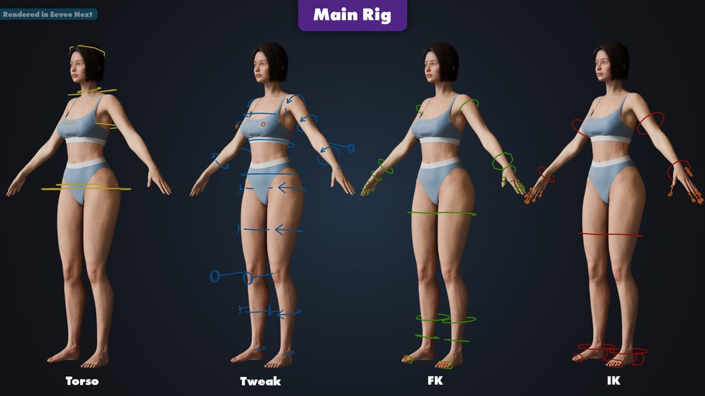 A fully rigged 3D character crafted for real-time rendering in Blender's Eevee Next (4.2+).