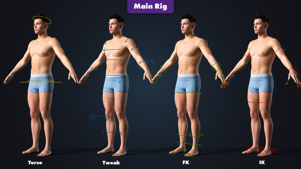 - IK/FK toggles, visibility layers, simplify control, snapping tools and pose resets